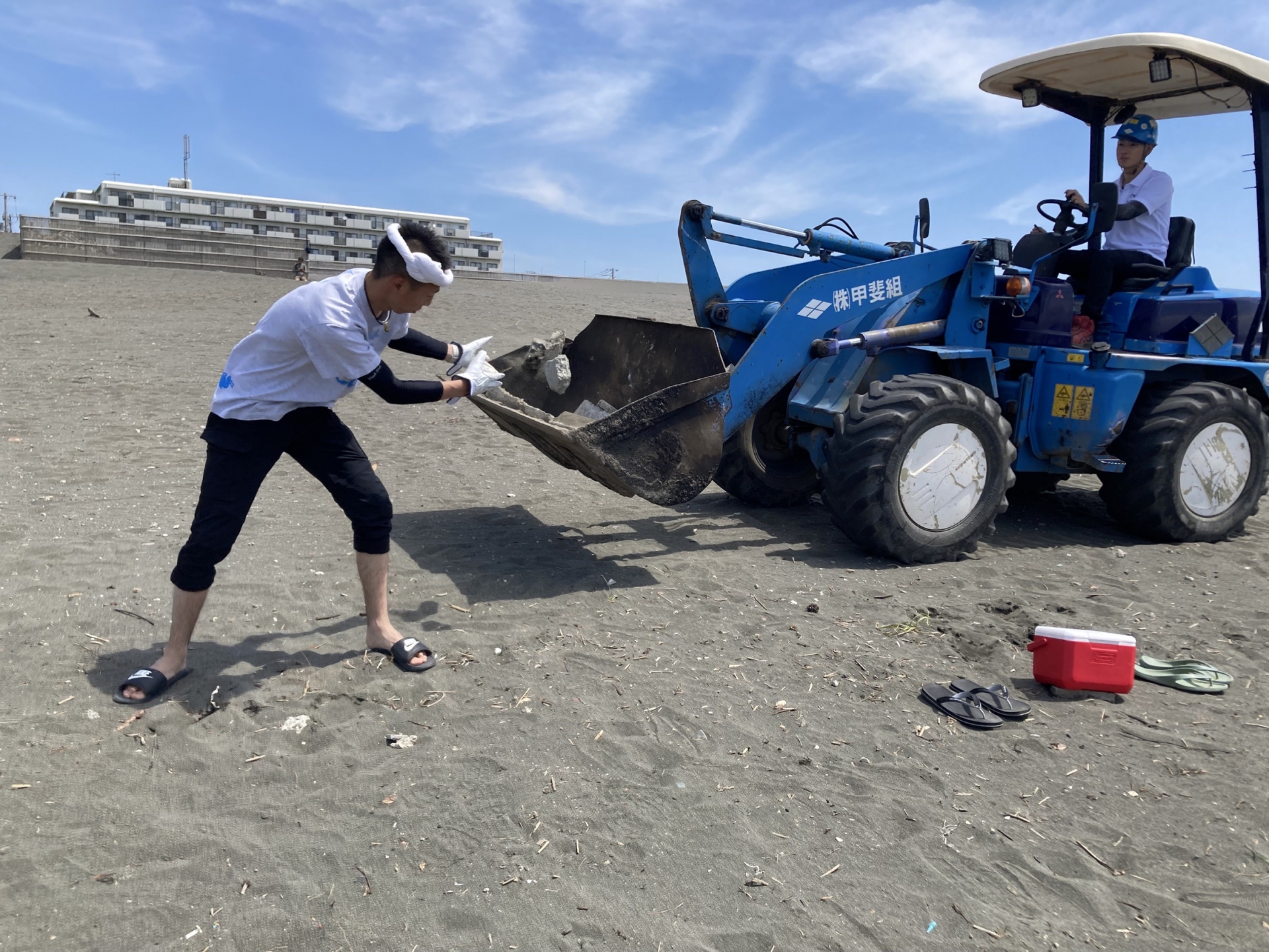 今年も建設業ならではの重機(ホイールローダー)を使用しながら、プラスチックごみ、たばこの吸い殻、コンクリート片、流木などを回収しました。2019年から継続している本活動により、年々ごみの量が減ってきていることを実感しています。